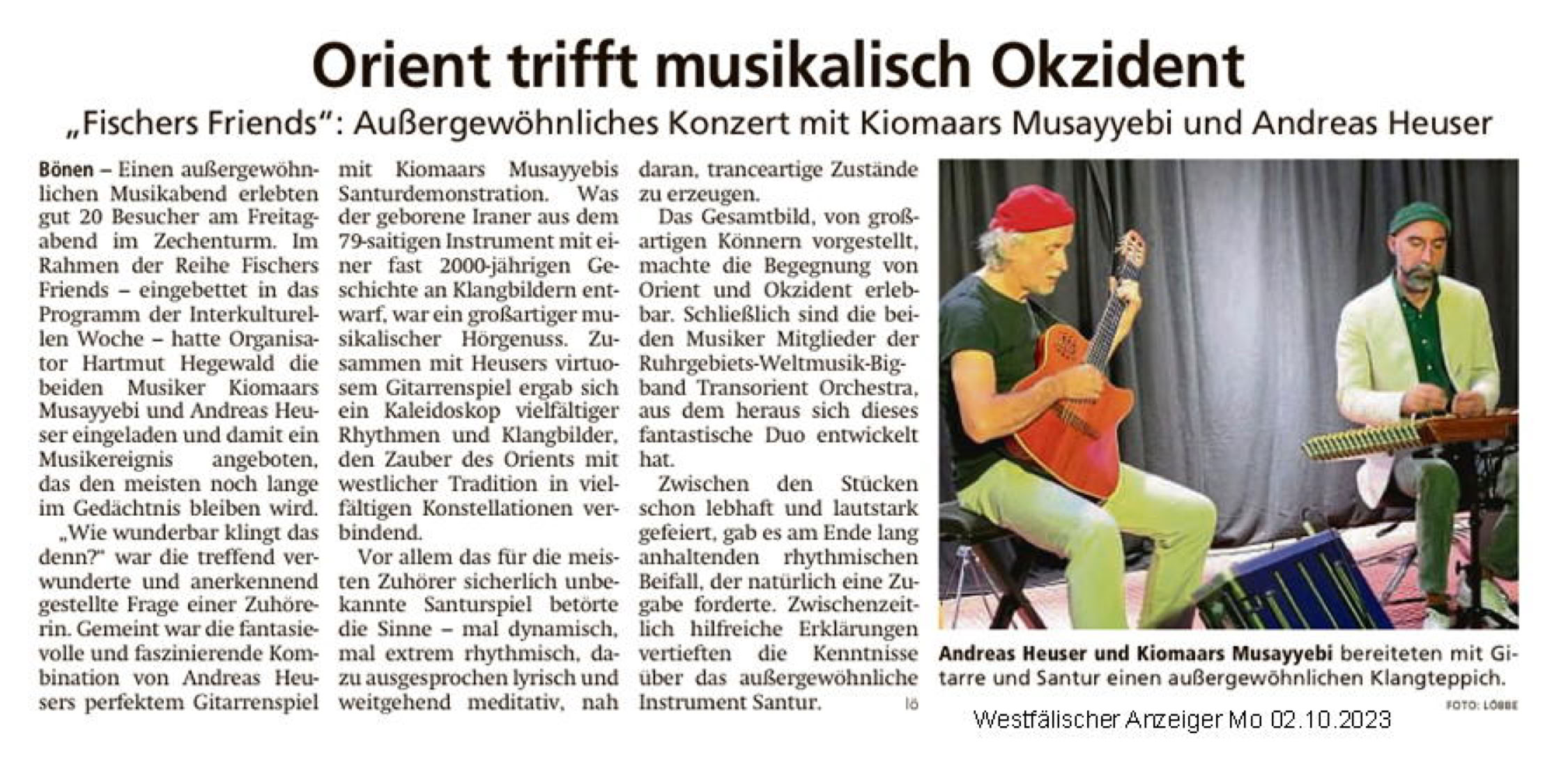 ... Beeindruckend und mit dementsprechend viel Applaus bedacht war schließlich auch der Auftritt des Weltmusikers Andreas Heuser an der Gitarre gemeinsam mit Kioomars Musayyebi am Santoor – einem dem Hackbrett verwandten Saiteninstrument, das mit Schlagstöcken zum Klingen gebracht wird und eigentlich in der klassischen persischen Musik zu Hause ist. Eigenkompositionen mit etwas eigenwilligen Titeln wie „Zip Zip“ erstaunten die Zuhörer auf Grund ihrer Verbindung von westlicher mit orientalischer Melodik und Rhythmik.