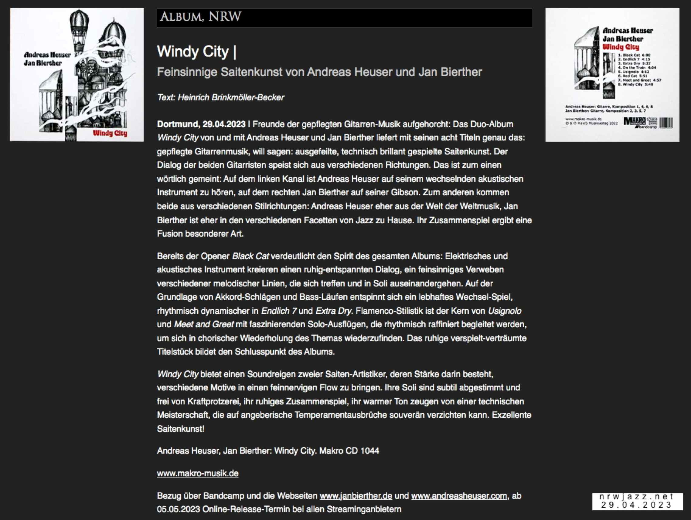 Dass Jan Bierther und Andreas Heuser dabei trotz ihrer stupenden technischen Fähigkeiten, die sie nur selten und dann sehr verhalten aufblitzen lassen, auf jedwede Überwältigungsartistik in ihren feinfühligen Dialogen verzichten, macht ihre zumeist sanft fließenden Stücke zu einem leichtgängigen Vergnügen nicht nur für Freunde anspruchsvoller Gitarren-Klangkunst. Weil sich in heiterer Gelassenheit hier delikate Melodien mit zarten Echoes der Jazz & Blues-Historie und rhythmischer Raffinesse zu farbenreichen Preziosen fügen, deren atmosphärische Intensität unmittelbar anrührend wirkt und so stille Glücksgefühle weckt.“